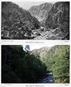 …looking back from the romantic Pont Aberglaslyn we have an uninterrupted view of naked brown precipices rising to the sky beyond the fir trees and the dashing stream at our feet. (Teas and refreshments may be obtained at the bridge.)