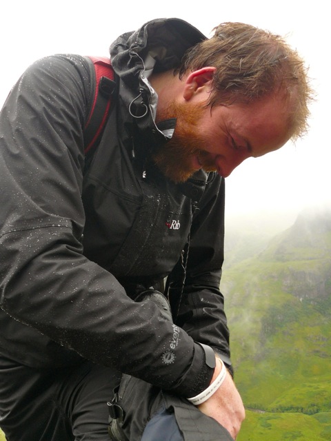 The clouds were low, which meant the views were mostly obscured, which was quite a pity as this route was named #3 most beautiful route by the Trail magazine (and that certainly does mean something :)!), but we still got a really nice walk out of it. Also the fogginess and occasional rain brought some good stuff with it, namely 1) the opportunity for me to put on my new fancy waterproof e-vent gaiters, and 2) there were no other people on the trail, which I assume otherwise in good weather turns into somewhat of a bloody tourist highway (I don’t count the unfortunate couple we met at the beginning, who decided to do the route with a rope, and who both looked so uncomfortable on the rock that it was quite scary to watch, and we can only hope they finished it ok).